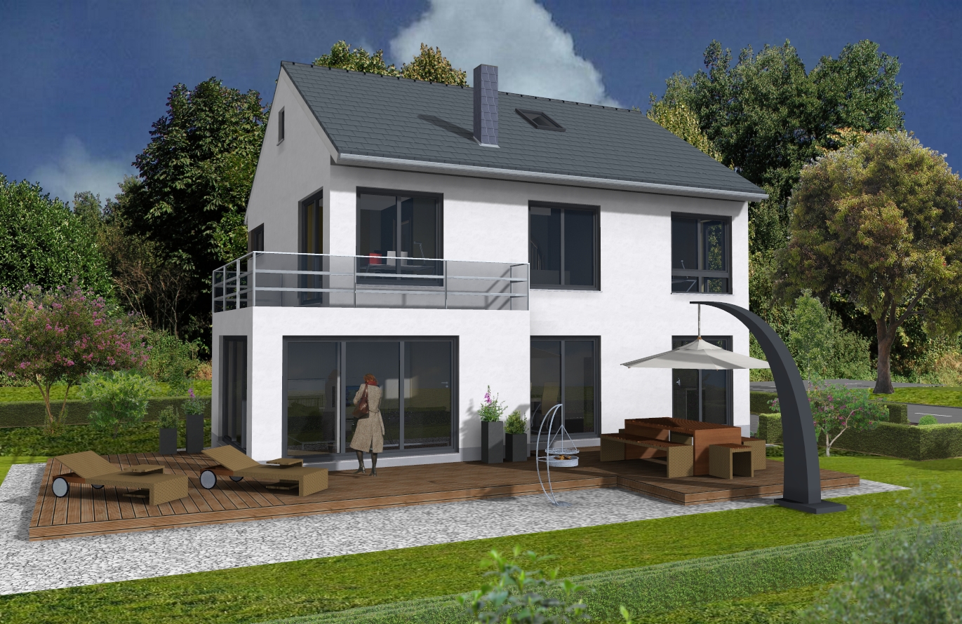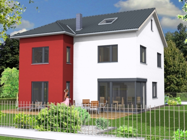 Ein modernes, zweistöckiges Dresdner Massivhaus besticht durch eine weiß-rote Außenfassade. Es verfügt über einen Balkon und eine Terrasse mit Gartenmöbeln. Das Haus ist von einem üppigen, grünen Rasen und Bäumen umgeben, im Hintergrund ein teilweise bewölkter Himmel.