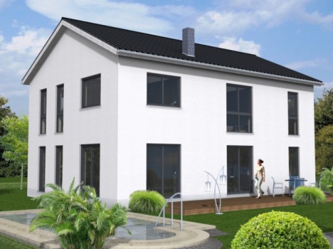 Dieses zweistöckige weiße Haus ist ein modernes Massivhaus in Sachsen und verfügt über große Fenster und ein dunkles Dach. Das Ganze ist von einem üppigen grünen Rasen und Pflanzen umgeben. Eine Person steht auf der Holzterrasse auf der Rückseite, wo ein kleiner Pool diesem wunderschönen Rückzugsort Charme verleiht, der perfekt für Liebhaber des Hausbaus in Dresden ist.